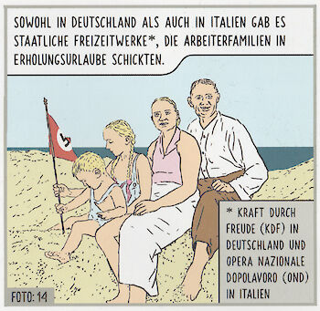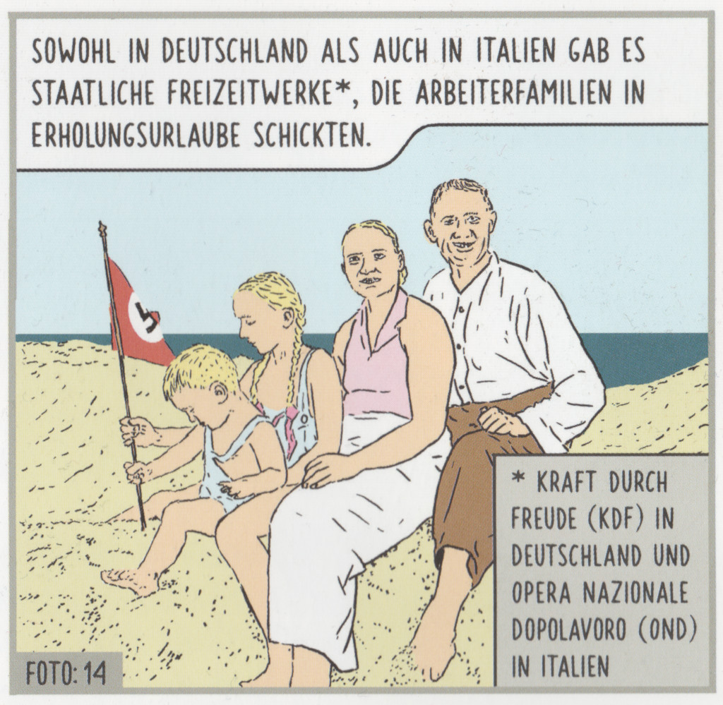 Ein halbes Hakenkreuz ist zum Beipsiel auf Seite 29. Dort ist eine Deutsche Famile beim Kraft-durch-Freude-Urlaub abgebildet, wo das kleinste Kind gemeinsam mit der Teenage-Tochter eine Hakenkreuzfahne in den Ostseestrand steckt.