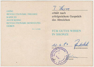 Und wenn man das Urkündchen aufschlägt, ist zu lesen, daß mir gutes Wissen bescheinigt wird - allerdings nur in Bronze, das klingt wie Platz 3, nicht so, als hätte ich zu 100% den marxistisch-leninistisch-sozialistischen Dreck nachplappern können.