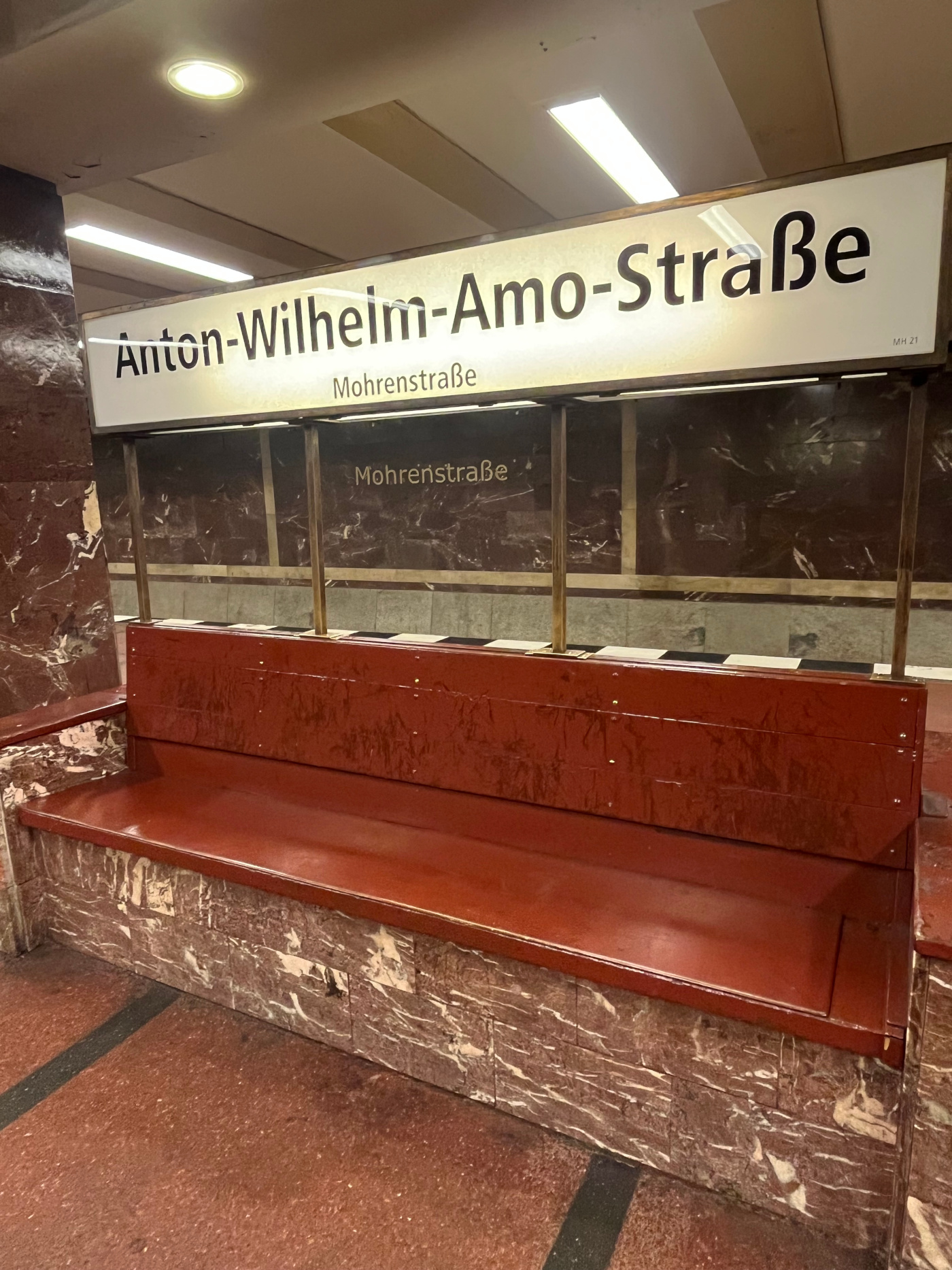 Die Frau mir gegenüber war sicher so überrascht wie ich, sie grinste, nachdem in der rumpelnden U-Bahn die Lautsprecherstimme verkündet hatte: "Nächste Station Anton-Wilhelm-Amo-Straße." Solch eine Station war mir auf der Strecke von Pankow bis Gleisdreieck fremd. Ich blickte erschrocken vom Buch auf, befürchtete, zu weit gefahren zu sein, es wäre nicht das erste Mal, doch als die U-Bahn in den U-Bahnhof einfuhr, erkannte ich ihn, den U-Bahnhof Mohrenstraße, der kürzlich umbenannt worden war.