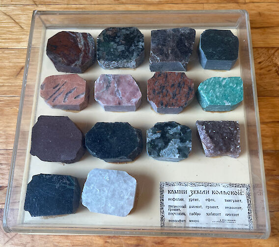 Im Alter von sieben Jahren habe ich diesen Plexiglaskasten geschenkt bekommen, in dem vierzehn Steine der Kola-Halbinsel eingeschlossen sind: