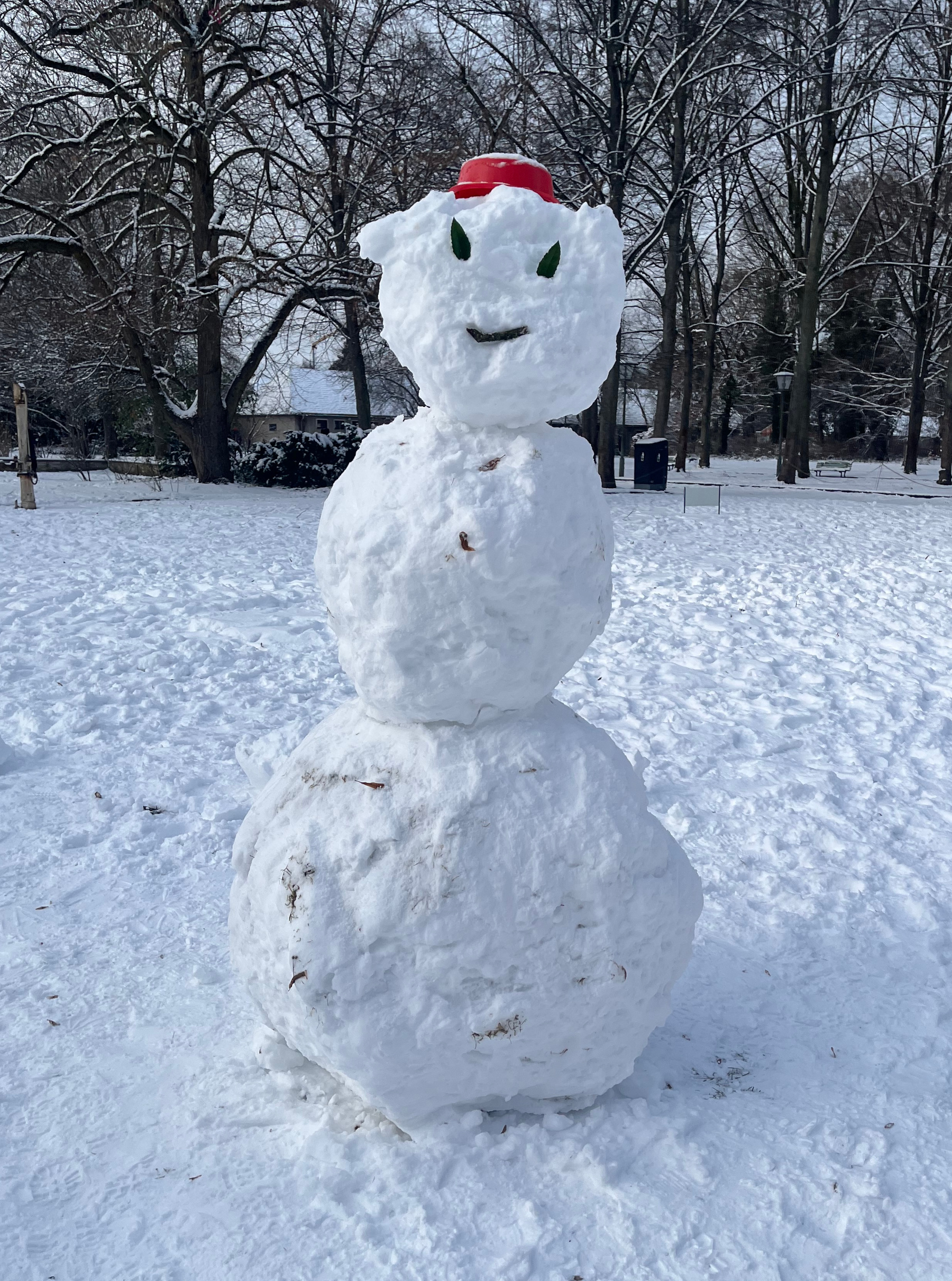 Sind sie nicht schön? Ein Schneemann mit rotem Hut.